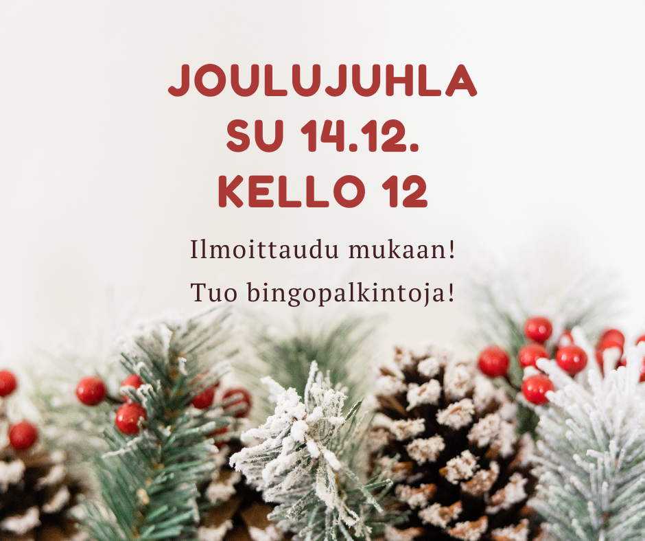 Tulossa: joulujuhla sunnuntaina 14.12. kello 12 alkaen. Muista ilmoittautua viimeistään tiistaina 9.12. Jaanalle, 040 718 3799. Lue lisää Tapahtumista!